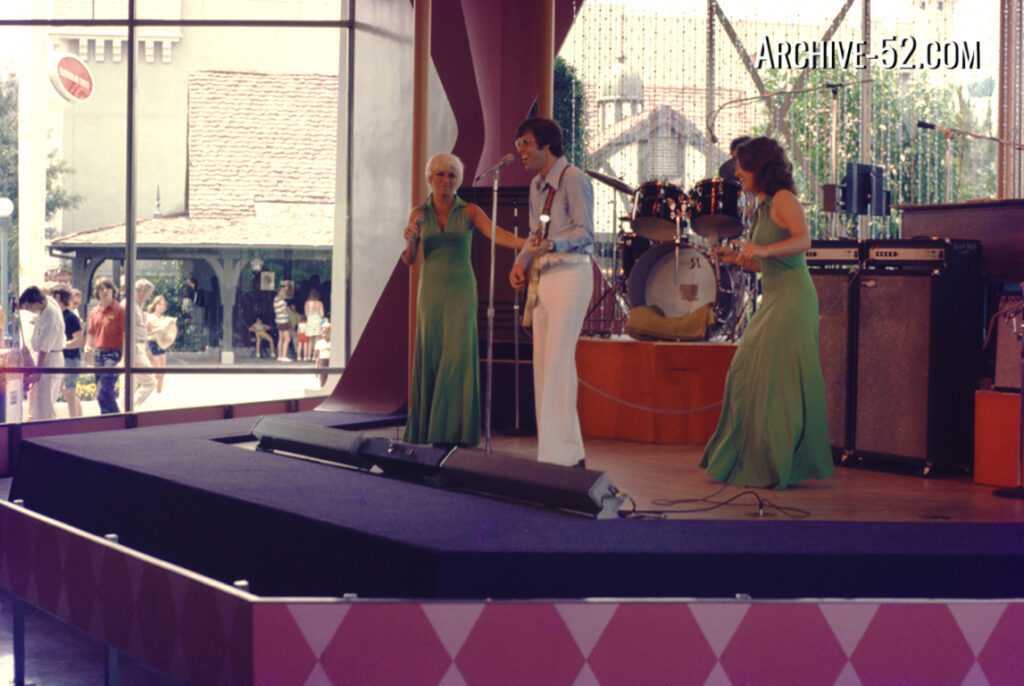 April, 1975. Magic Kingdom – Tomorrowland March 26, 2026March 23, 2026 • Archive52 A music group plays on the descending stage of the Tomorrowland Terrace, now Cosmic Ray’s Starlight Cafe. The Fantasyland Art Corner visible through the window.