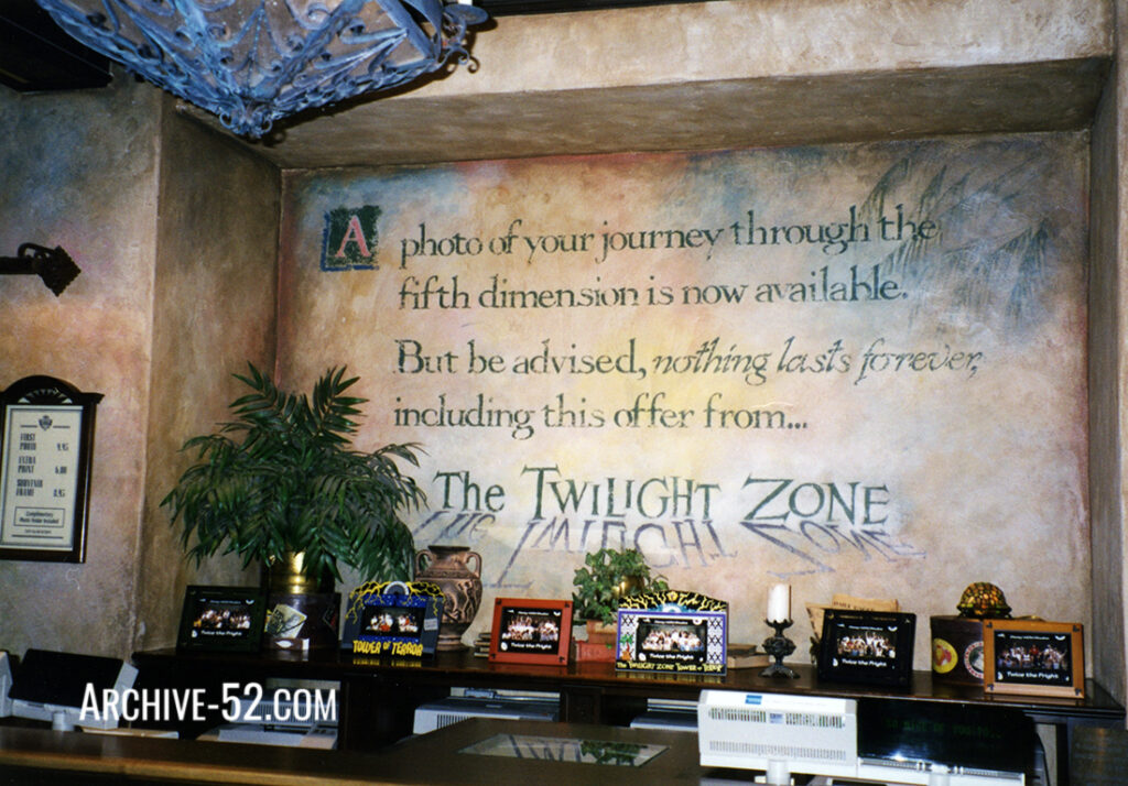 The photo purchase area in The Twilight Zone, Tower of Terror. A mural over the registers (painted over,) reminds the Guests of the timely nature of purchasing photos. Photo prints started at $9.95, additional prints at $6.00 and the souvenir frame at $8.95.