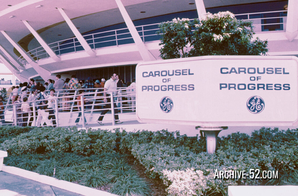 Circa 1970’s. Magic Kingdom – Tomorrowland April 10, 2026April 5, 2026 • Archive52 From the Magic Kingdom ShowPac of Commercially Available Slides. The Entrance to the General Electric Carousel of Progress.